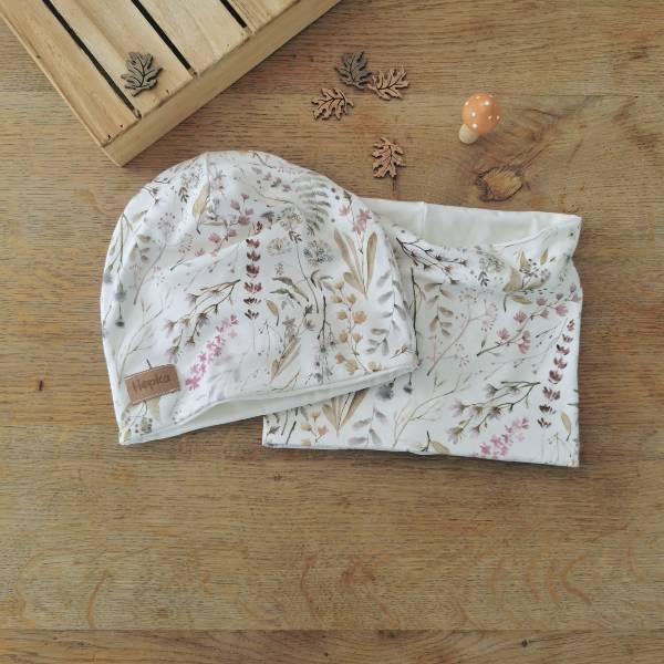 Kapa in šal sta dvoslojna in primerna za obojestransko nošenje. Primerno za prehodna obdobja ali zmerno mrzlo zimo.