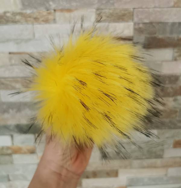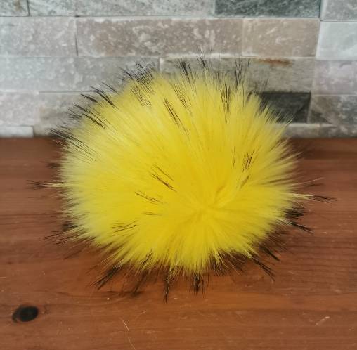 Ročno izdelan cof iz umetnega krzna v lepi sončno rummeni barv s temnejšimi konicami. Možne so tri velikosti in dva različna načina za nameščanje cofa na izdelek: Z dvema vrvicama ali po novem s že prišitim pritiskačem.